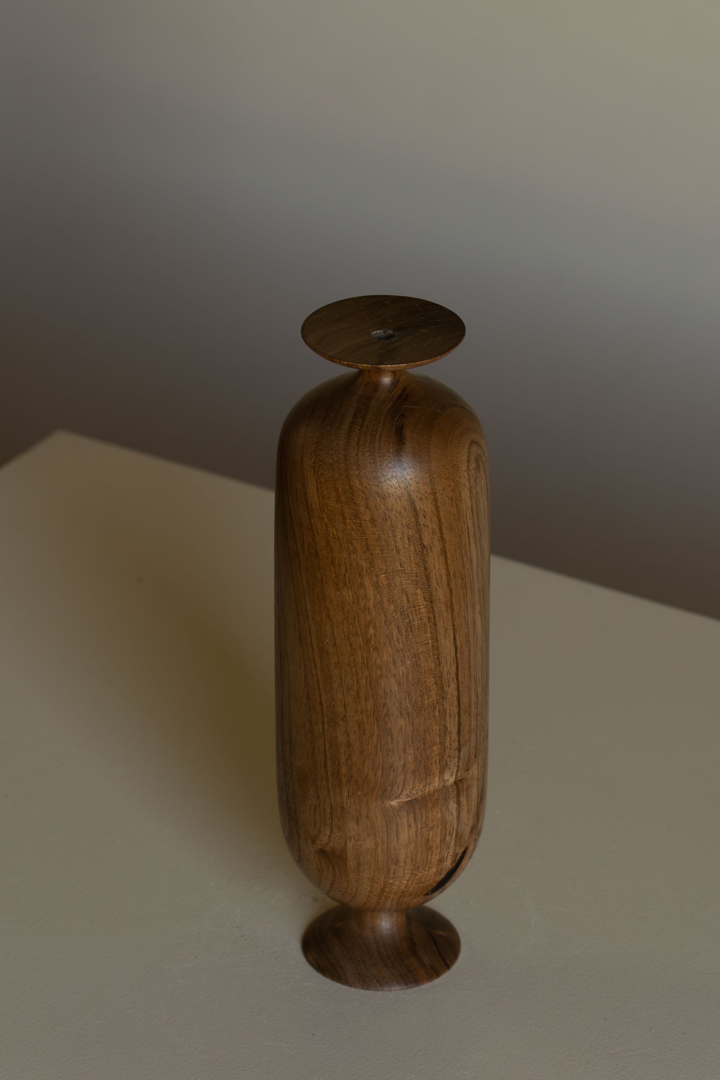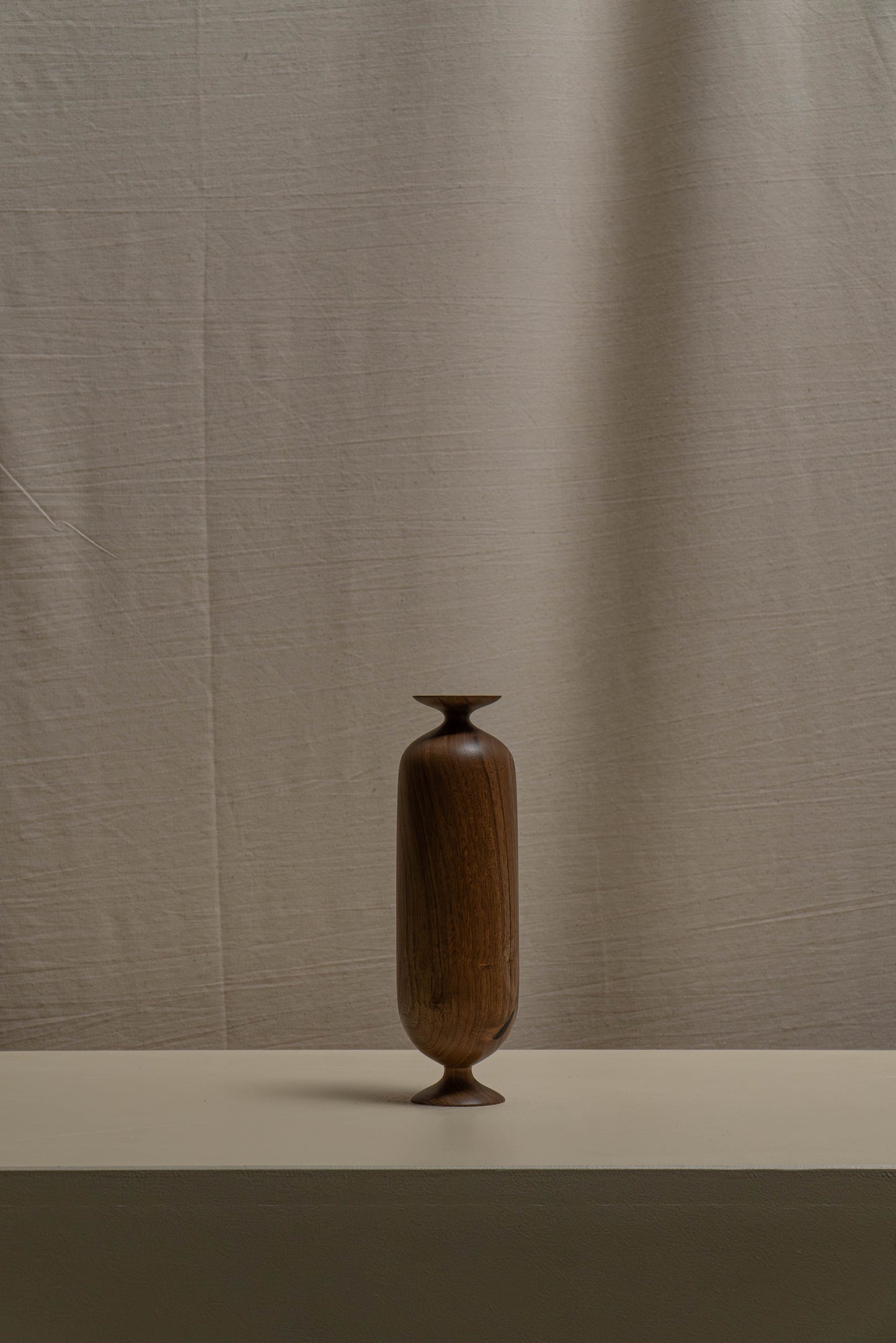 Soliflore en bois tourné (noyer). Chaque pièce est unique. Le bois tourné a la particularité de laisser apparaître des fissures, cet aspect est tout à fait normal. Les particularités du bois (nœuds, variations de couleur) ne doivent pas être interprétées comme des défauts, mais reflètent la nature artisanale de l'objet.