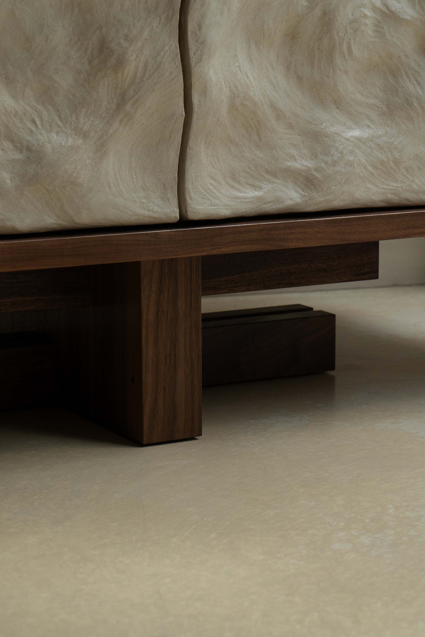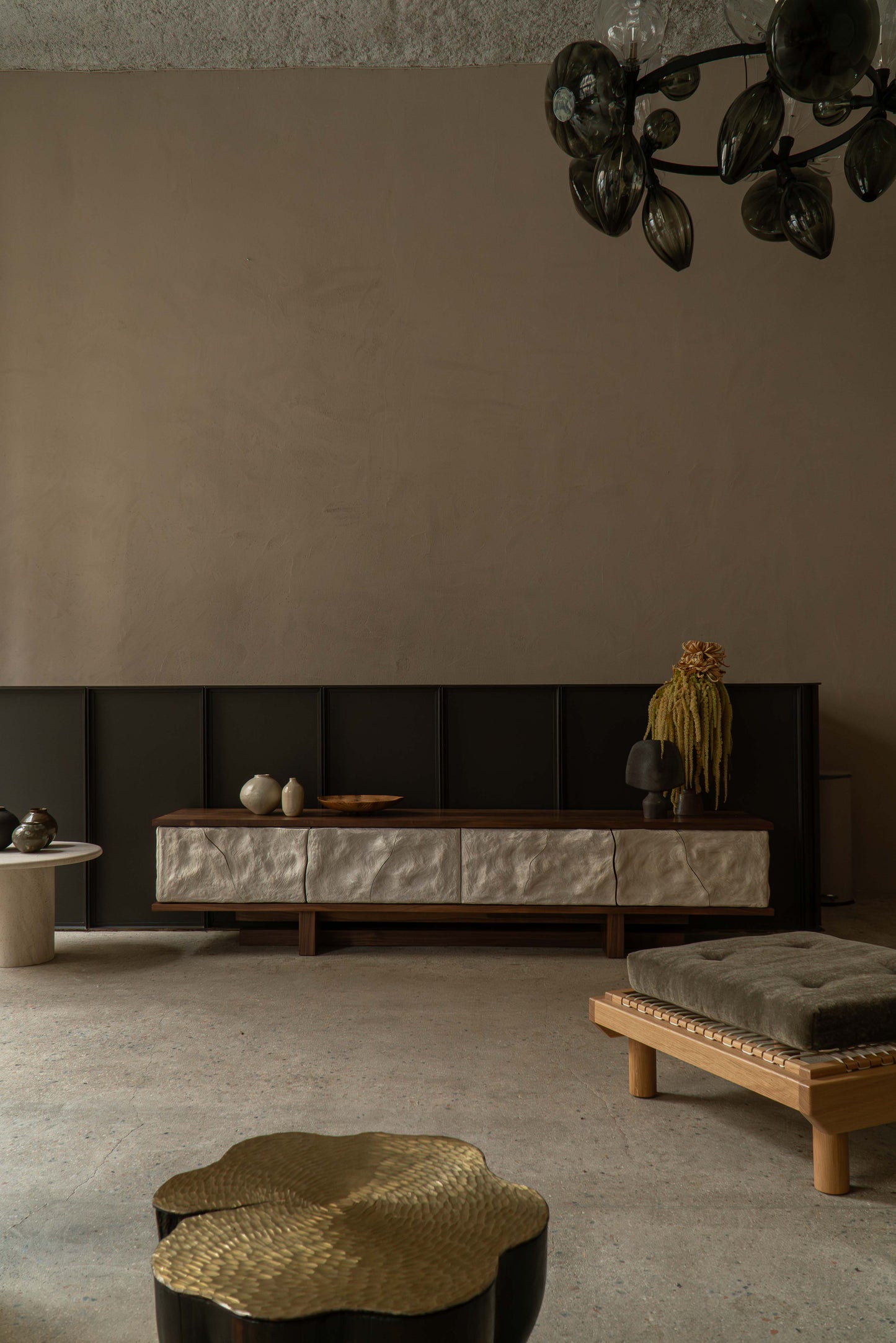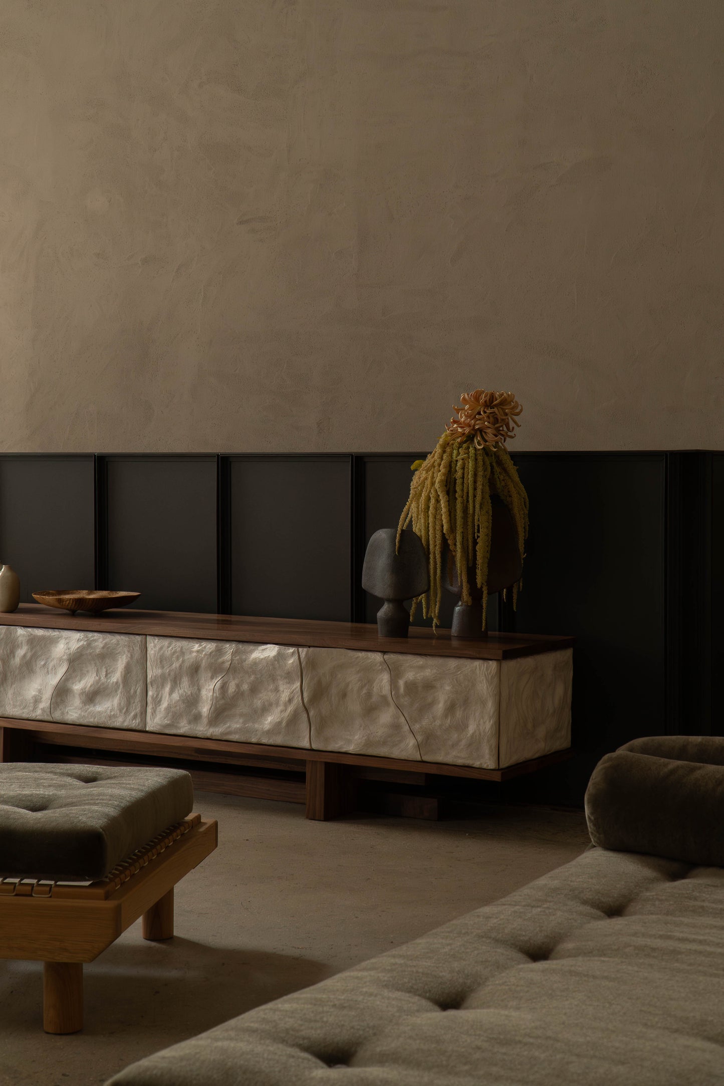 Longue enfilade en noyer américain massif recouverte de plaques de céramique façonnées à la main. Œuvre unique de la sculptrice Claire Cosnefroy en référence aux pierres des rues antiques de la ville d’Arles, chaque élément en terre blanche est émaillé et ciré. La structure aux lignes tendues, dessinée par Paul Michelon, contraste avec les lignes organiques de la terre.