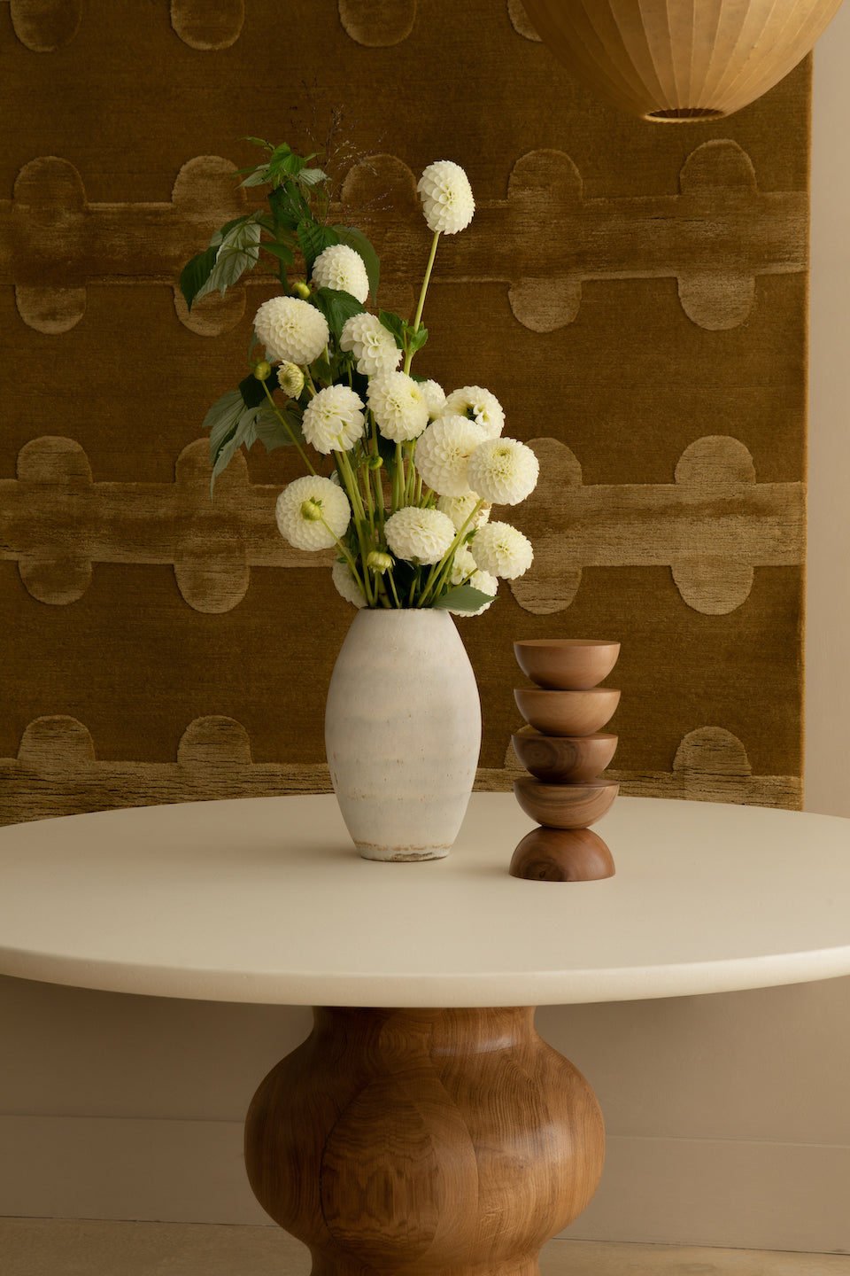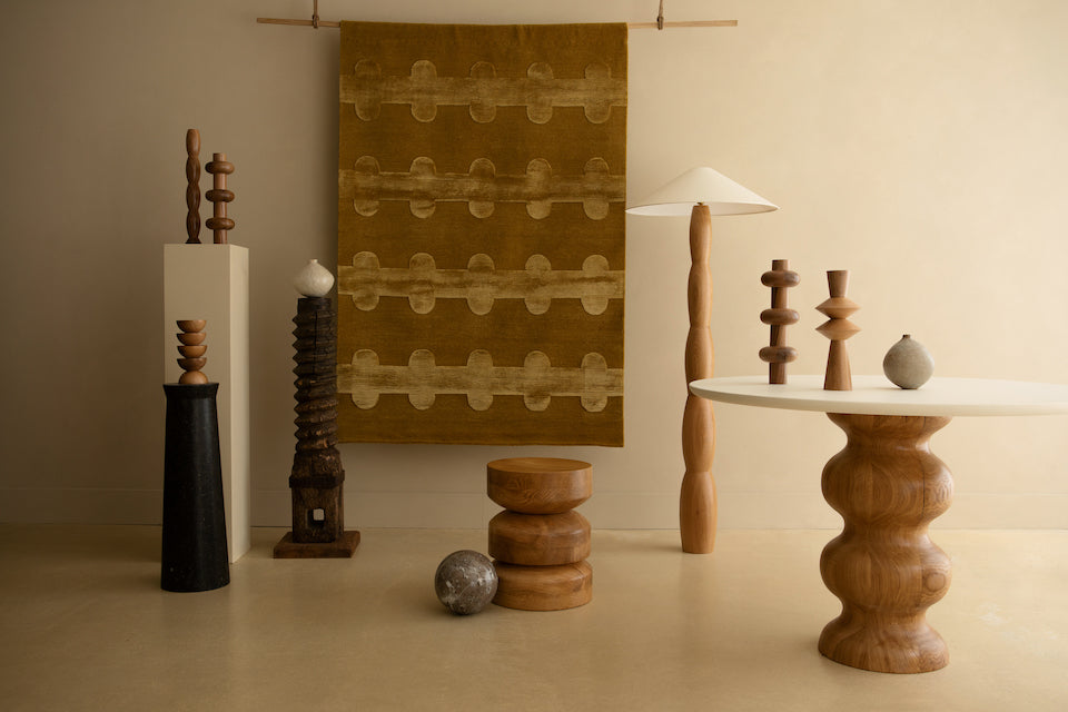 À la croisée de l’univers du studio et des éditions La Lune, elle est le résultat d’une réflexion entre Hélène Pinaud, Julien Schwartzmann et Madeleine Froment. Les pièces présentées empruntent un vocabulaire architectural primitif et graphique, répétant, interrompant des successions de formes géométriques. La lecture de ces silhouettes est multiple et renvoie à différentes références artistiques, on peut y lire un hommage à Brancusi, aux totems amérindiens, à l’art de la torsade des meubles du XIXe siècle, aux céramiques de Hans Coper, aux luminaires de Noguchi. S’appuyant sur le savoir-faire d’artisans, et sur un échange vivant, chaque pièce est le résultat d’un dialogue singulier. Les allers-retours au sein d’ateliers, l’appréhension de la matière et des techniques sont au cœur de la démarche des éditions La Lune et de Heju.