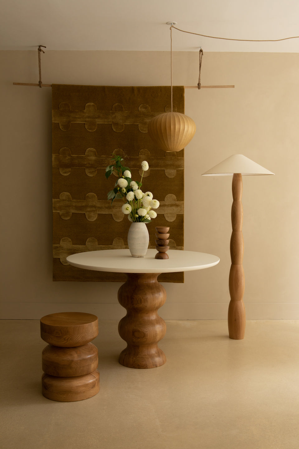 À la croisée de l’univers du studio et des éditions La Lune, elle est le résultat d’une réflexion entre Hélène Pinaud, Julien Schwartzmann et Madeleine Froment. Les pièces présentées empruntent un vocabulaire architectural primitif et graphique, répétant, interrompant des successions de formes géométriques. La lecture de ces silhouettes est multiple et renvoie à différentes références artistiques, on peut y lire un hommage à Brancusi, aux totems amérindiens, à l’art de la torsade des meubles du XIXe siècle, aux céramiques de Hans Coper, aux luminaires de Noguchi. S’appuyant sur le savoir-faire d’artisans, et sur un échange vivant, chaque pièce est le résultat d’un dialogue singulier. Les allers-retours au sein d’ateliers, l’appréhension de la matière et des techniques sont au cœur de la démarche des éditions La Lune et de Heju.