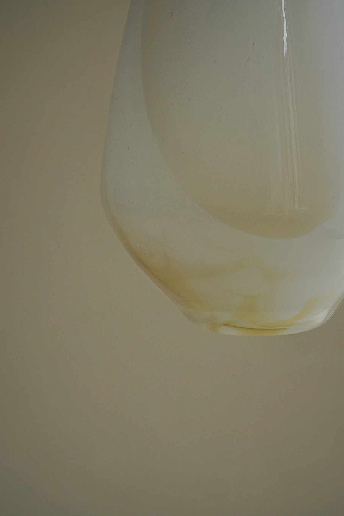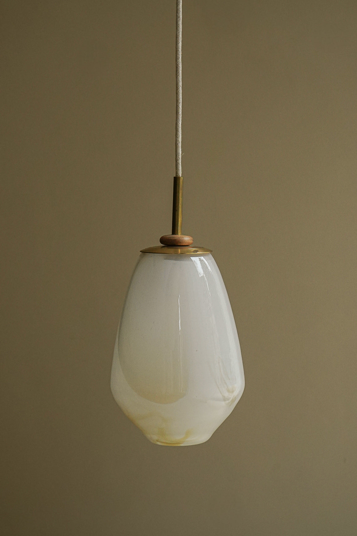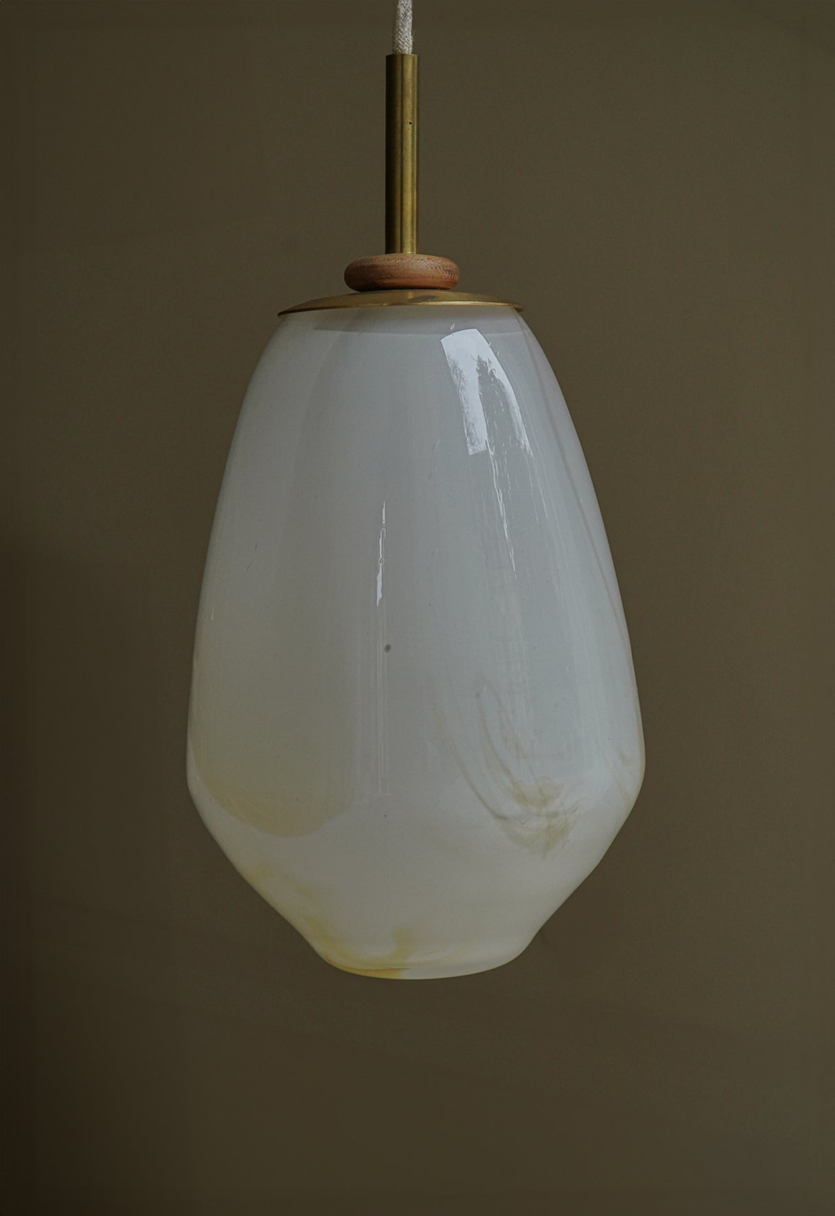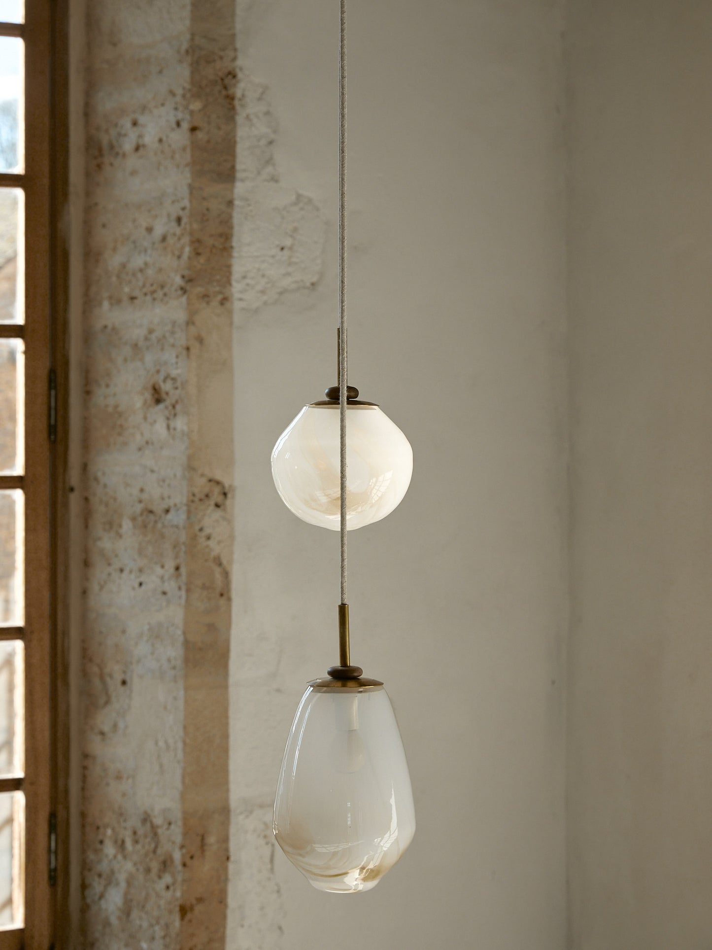 Suspension en verre soufflé Magena II. Réalisée en exclusivité pour les éditions La Lune par le duo de designer / verrier Atelier George. Câble en lin, pièce en laiton et bague en bois tourné.