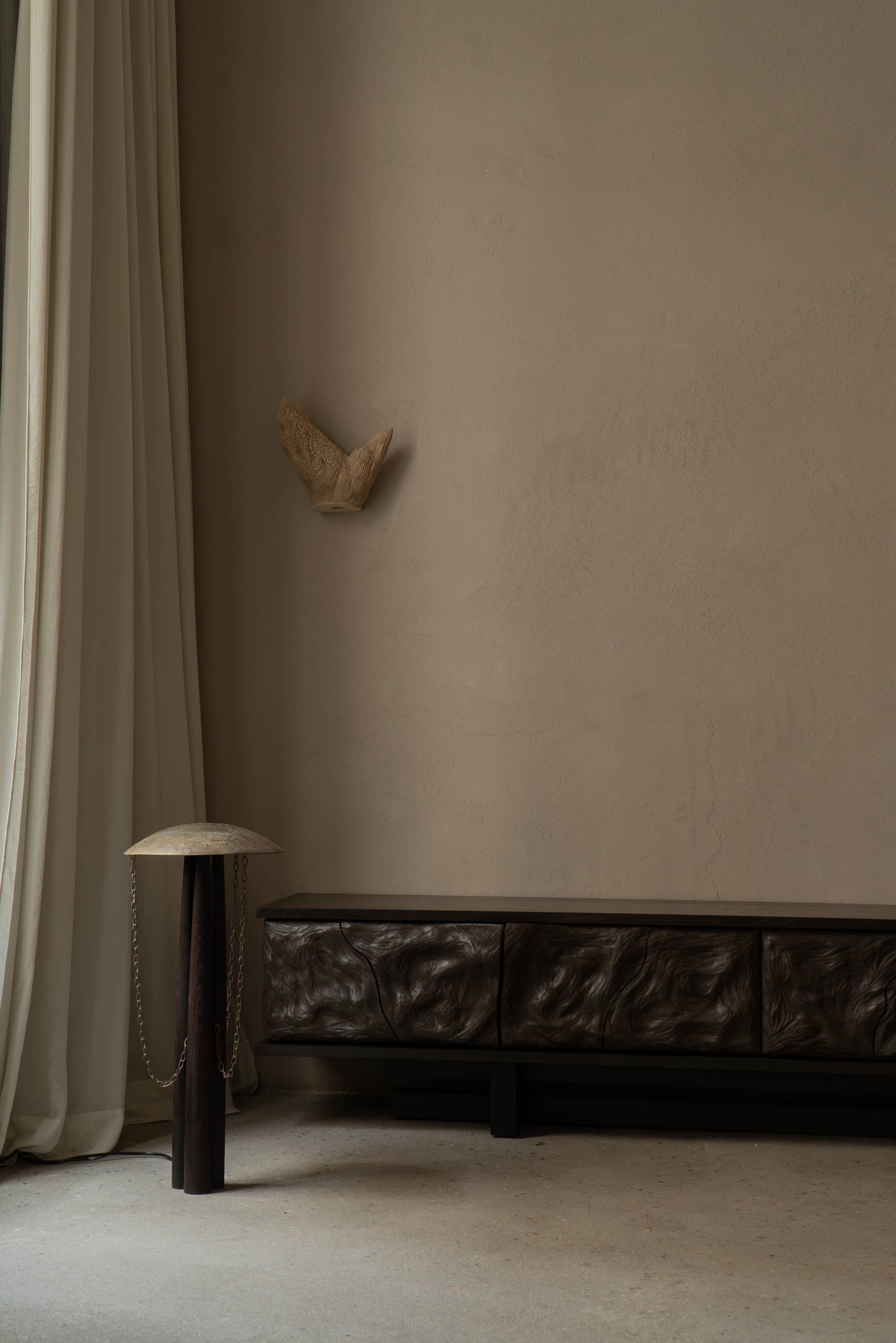 «La trace, les procédés de fabrication, les accidents sont des marques du temps qui animent la matière. On y retrouve différentes strates et étapes d’altération, naturelles ou artificielles dont le statut demeure ambigu. Lors de marche ou déambulation urbaine, par la collecte de matériaux et d’artefacts, commence mon processus de création. Un objet glané a un potentiel narratif et par la diversité de sa provenance, peut être la source de multiples récits. Composer avec ce dernier devient une contrainte, constitutive de mon travail. On y découvre parfois un paysage suspendu. Les mobiles sont composés principalement de pierres, de bois et de métal trouvés lors de ces recherches. Un système de maintiens, d’équilibres et de tensions s’imposent, entrelaçant aspérités et formes singulières des éléments en lévitation. Chaque installation fonctionne comme un univers, où les corps et les formes dialoguent dans l’espace, développant des relations et des articulations entre eux.»
