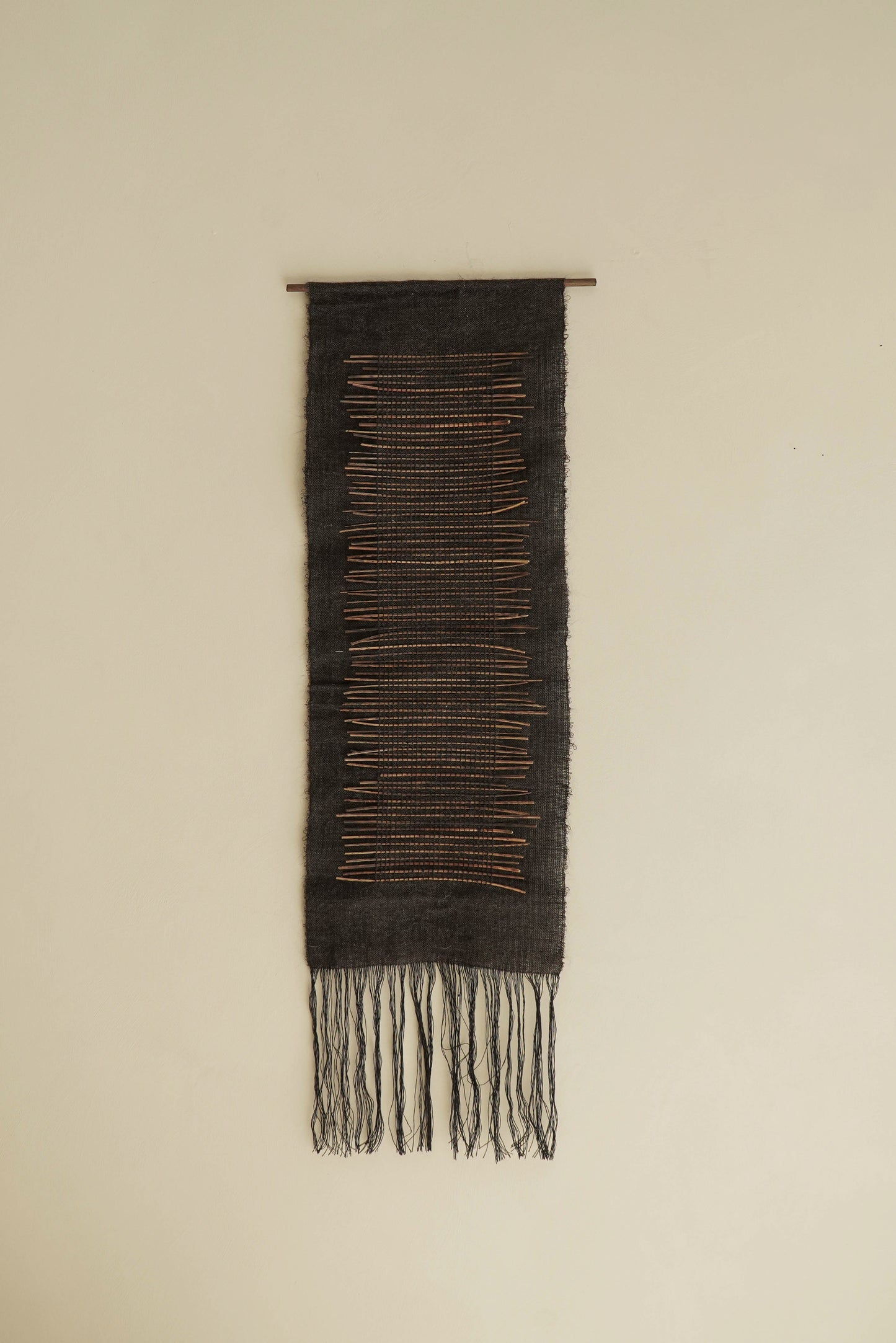 Emma Shepherd, tisserande basée à Flinders, pratique l’un des métiers les plus anciens au monde avec la sensibilité d’une artiste profondément ancrée dans son environnement. Son travail est l’occasion de réfléchir à la fibre, à son rôle dans l’histoire de l’humanité et à l’héritage du tissage en tant que premier algorithme. En pensant au tissu, à sa résistance et à sa structure, ainsi qu’à la philosophie des textiles du Bauhaus, Emma Shepherd joue avec les couleurs proches des feuillages verts, des tons sombres des troncs d’arbres ainsi que des tons neutres du sable et des rochers de sa ville natale, Flinders. Ses œuvres incorporent des matériaux comme des aiguilles de pin, du crin de cheval et de l’écorce provenant de l’environnement immédiat d’Emma Shepherd, lui permettant de façonner une œuvre douce mais délibérée.