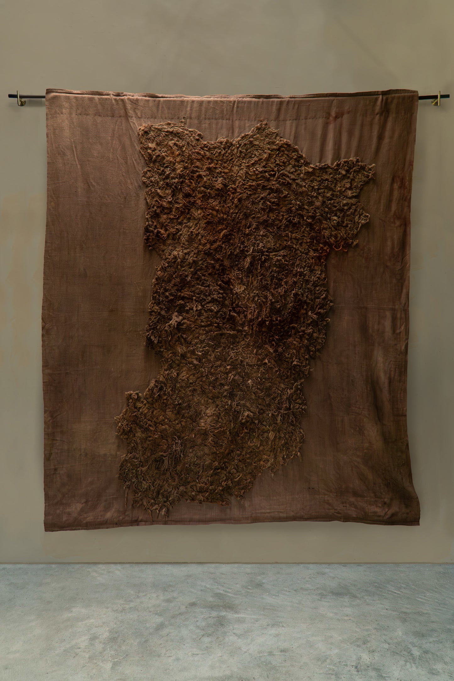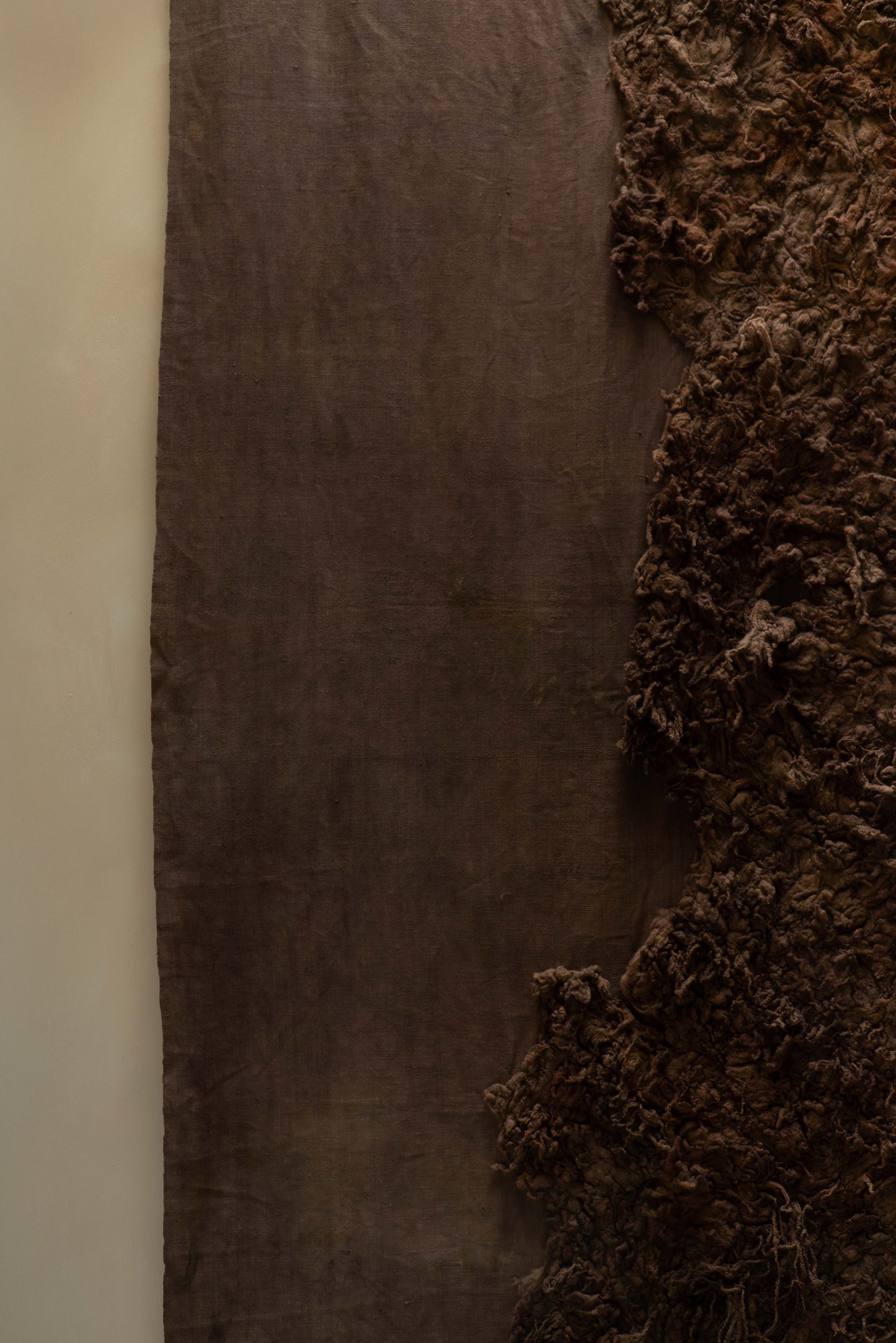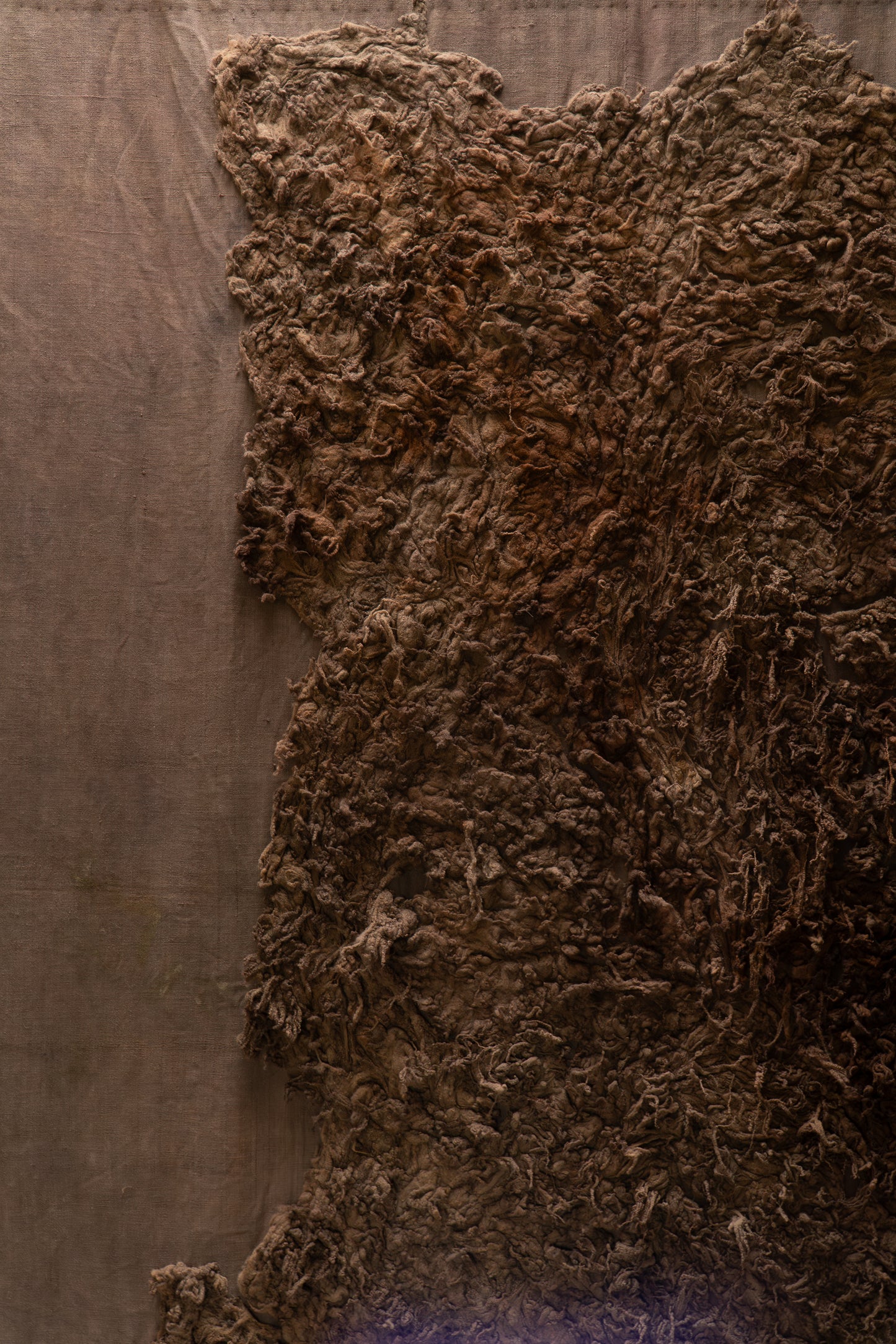 Œuvre textile murale de l'artiste Aurore Pelisson, composée de la tonsure complète d'un mouton patiemment lavé et cousu sur un drap de lin puis teinté grâce à des procédés naturels.